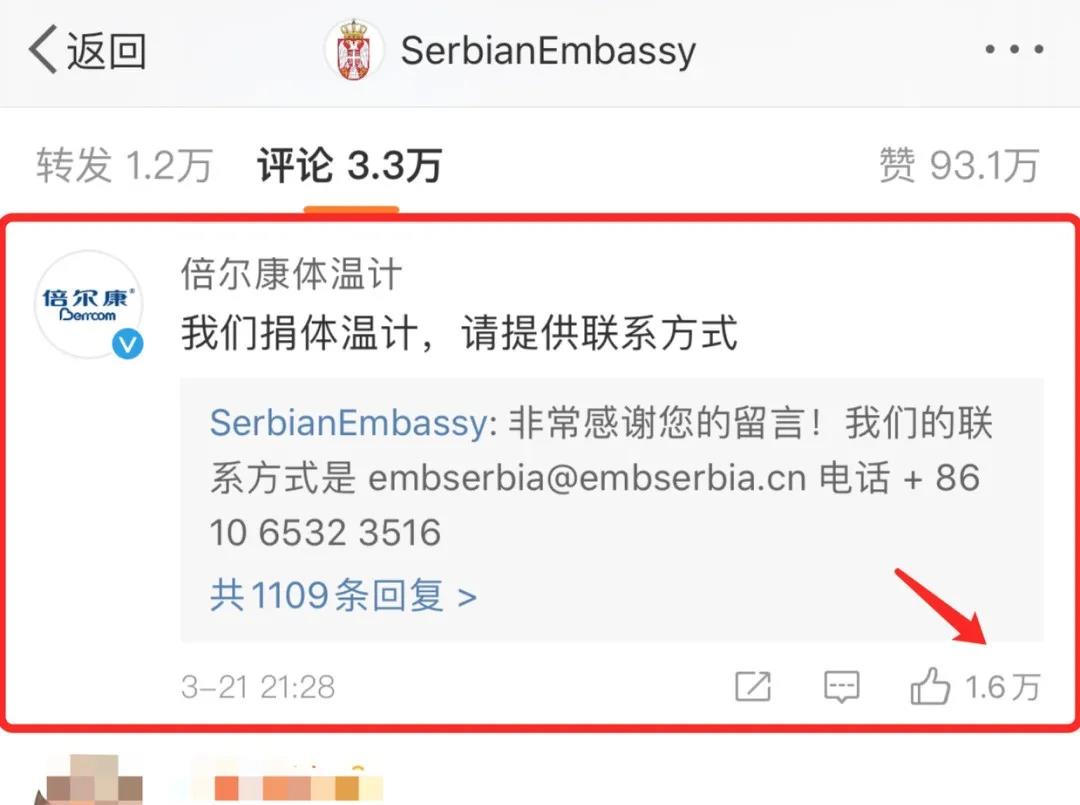 當(dāng)小倍看到里面的物資列著“非接觸式紅外體溫計”時,迅速留言表示了捐贈意向,隨即收到大使館的回復(fù)以及網(wǎng)友的1.6萬個贊。