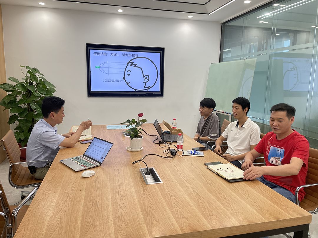 周斌(右二)和倍爾康公司工程師討論下一代紅外測(cè)溫槍方案